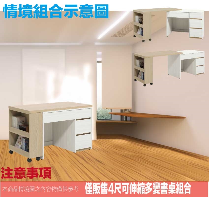 - ◆產品名稱:【綠家居】亞畢克4尺四抽可變化書桌組合(書桌面板可伸縮&櫃身可變化使用)