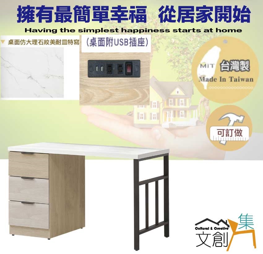 【綠家居】 蘿克4尺三抽鐵腳書桌(附插座單個) 現代雙色系+安心材質製造,使用放心+搭配居家更便利,採用防蛀木心板+防潮耐磨底座+烤漆五金腳座+五金滑軌結構+仿大理石紋耐磨美耐皿材質桌面板等安心材質製造 ,外層採用防潮耐磨噴漆處理搭配採用三抽屜+開放層格+附插座單個等收納空間設計,全由專人配送到家,專業安心服務,替你省下更多時間!