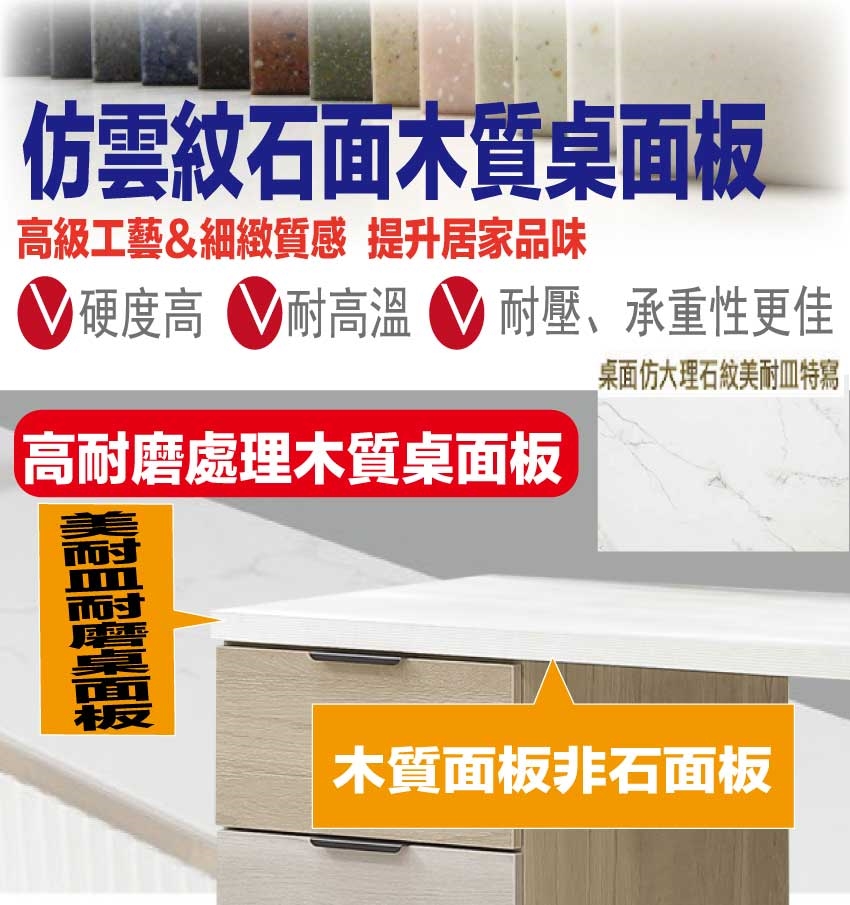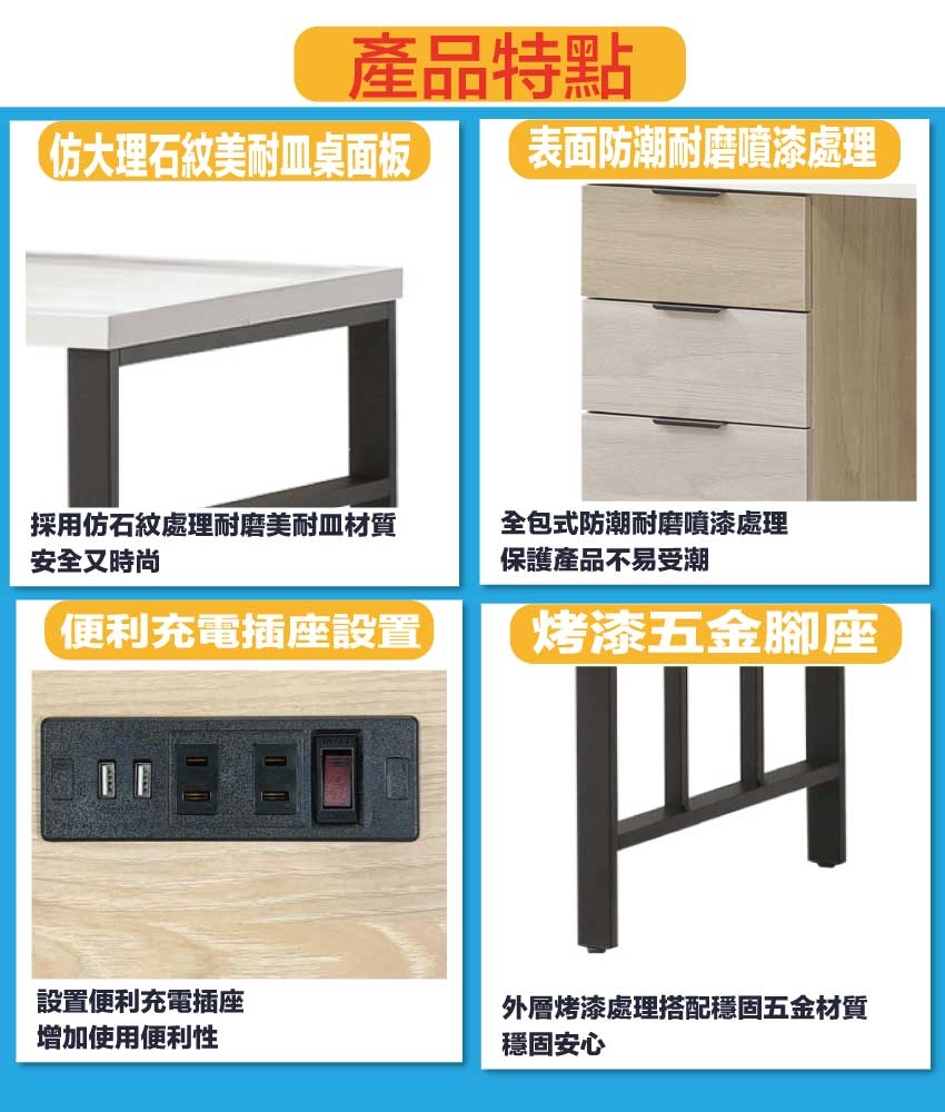 採用防蛀木心板+防潮耐磨底座+烤漆五金腳座+五金滑軌結構+仿大理石紋耐磨美耐皿材質桌面板等安心材質製造