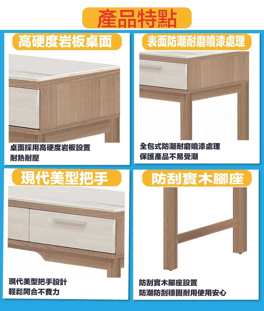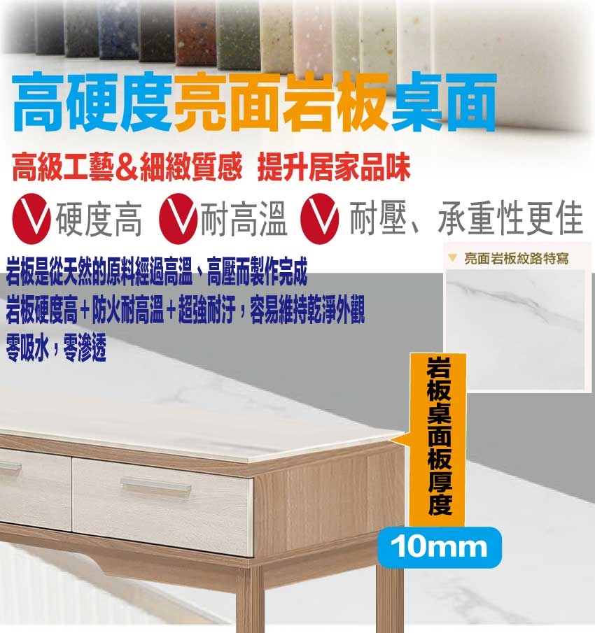 採用防蛀木心板+防刮實木腳座+10mm高硬度岩板頂板等安心材質製造