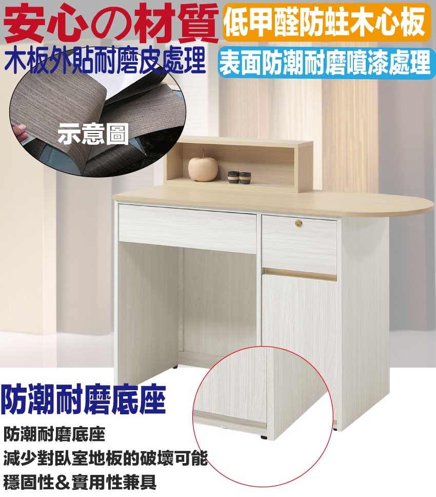★偏遠地區需額外加收運費,下標請先問與答詢問★ ★下訂前注意 由於商品流動較快,下訂前請先詢問是否有貨在下訂喔~★ 【綠家居】亞畢克4尺多功能書桌櫃 現代雙色系+安心材質製造,使用放心+搭配居家更便利,採用防蛀木心板+防潮耐磨底座+五金滑軌結構+防夾手緩衝門片五金等安心材質製造 ,外層採用防潮耐磨噴漆處理搭配採用開門櫃+二抽屜+內&外開放層格等收納空間設計,全由專人配送到家,專業安心服務,替你省下更多時間!