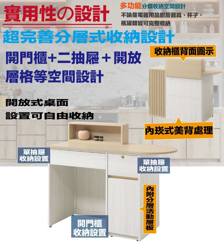 搭配採用開門櫃+二抽屜+內&外開放層格等收納空間設計