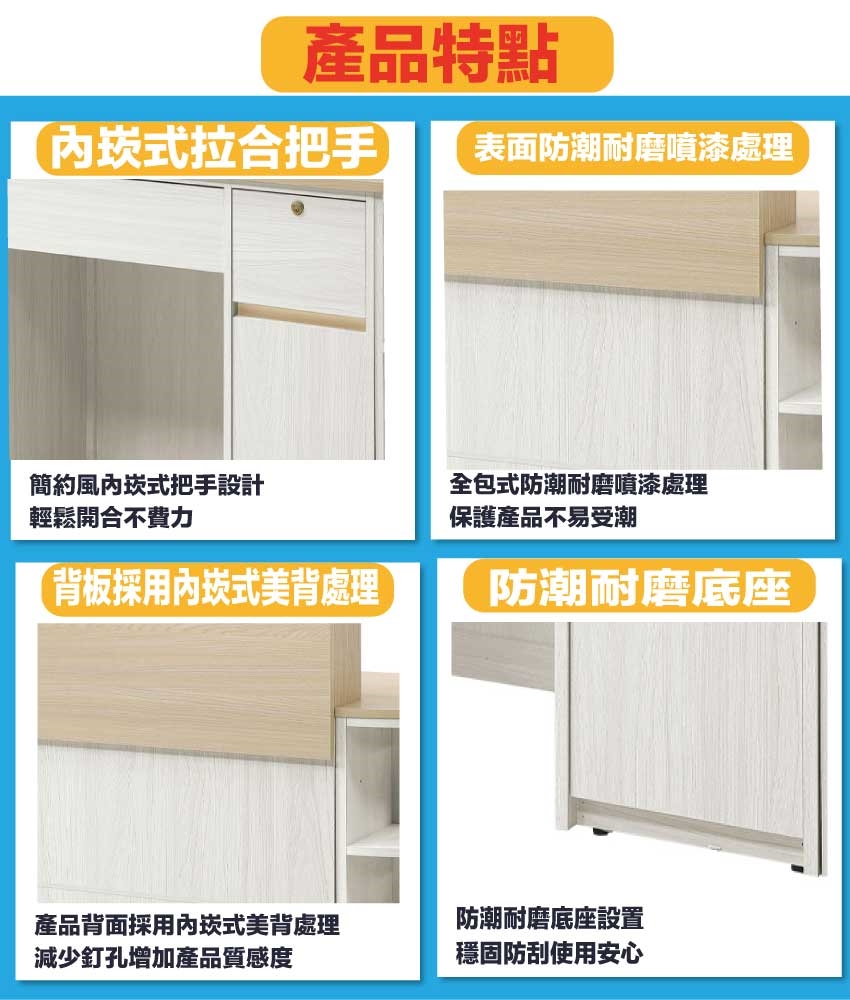 材質:防蛀木心板+防潮耐磨底座+五金滑軌結構+防夾手緩衝門片五金