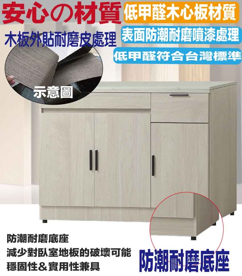 材質:防蛀木心板+防潮耐磨底座(可調高低水平)+防夾手緩衝門片五金-