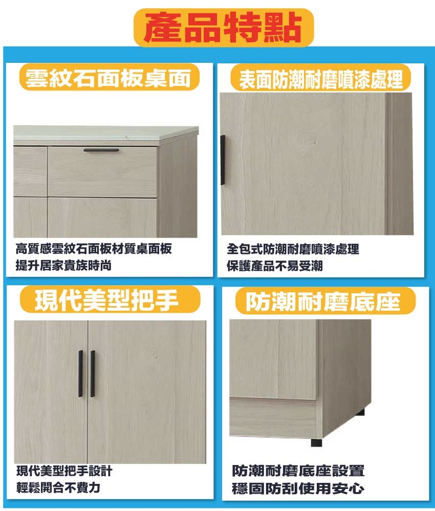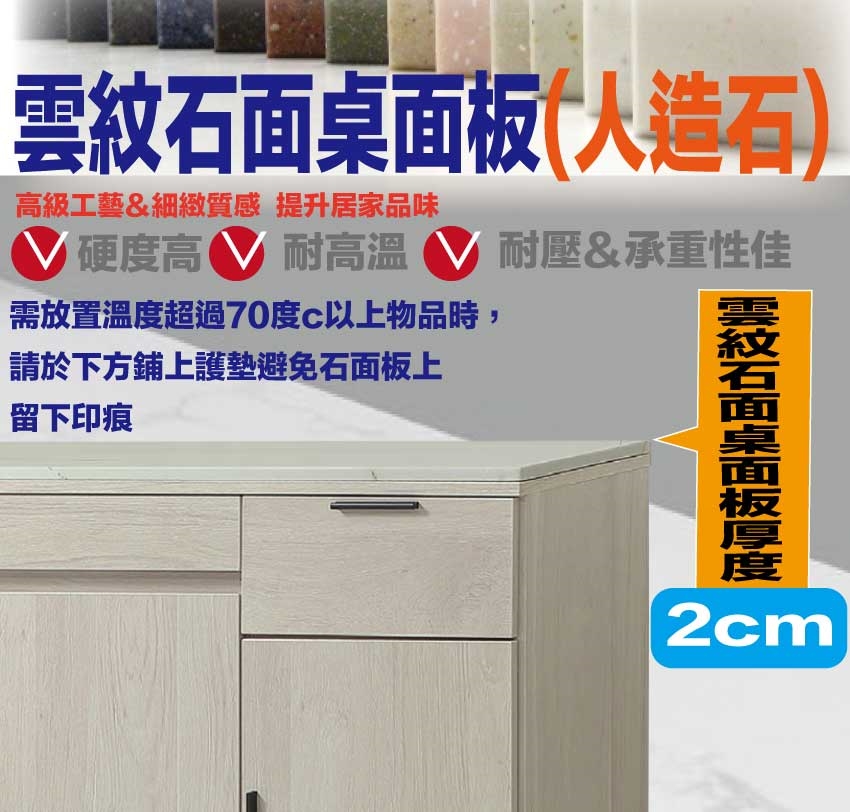防蛀木心板+防潮耐磨底座(可調高低水平)+2cm雲紋石面桌面板+防夾手緩衝門片五金等安心材質製造