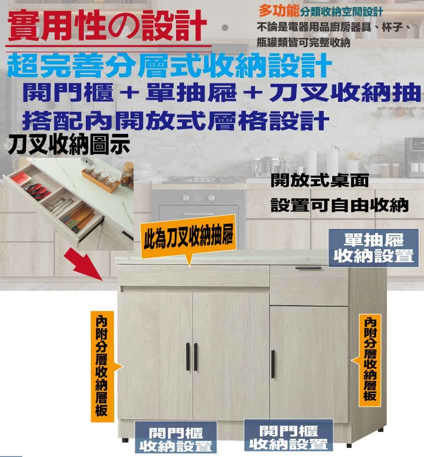 採用開門櫃+二抽屜(內含刀叉收納抽屜)+內開放層格等收納空間設計