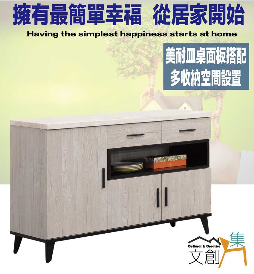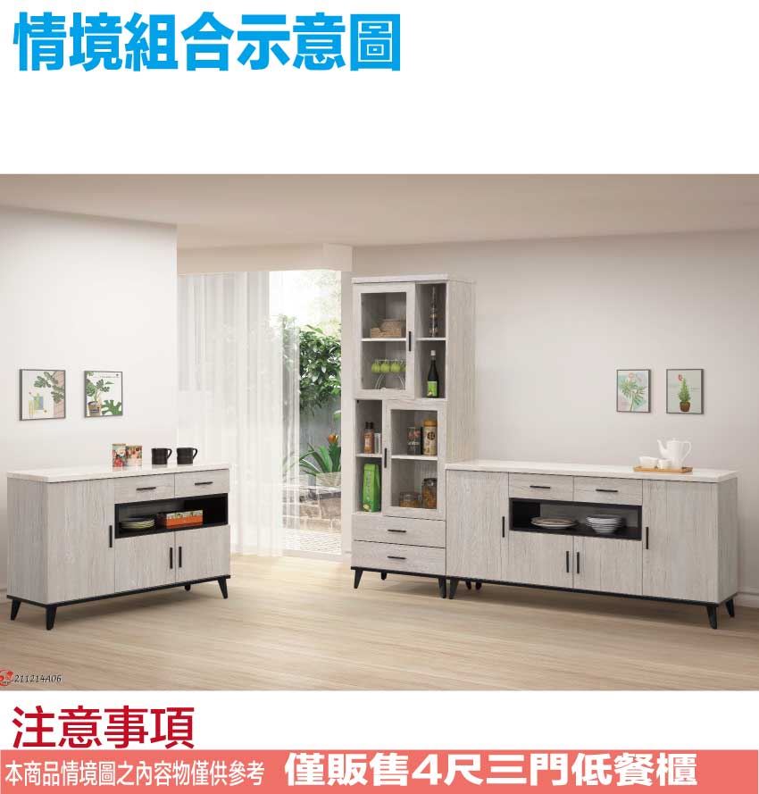 - 產品名稱:【綠家居】凱曼雙色4尺三門二抽低餐櫃(仿石紋耐磨美耐皿桌面板)