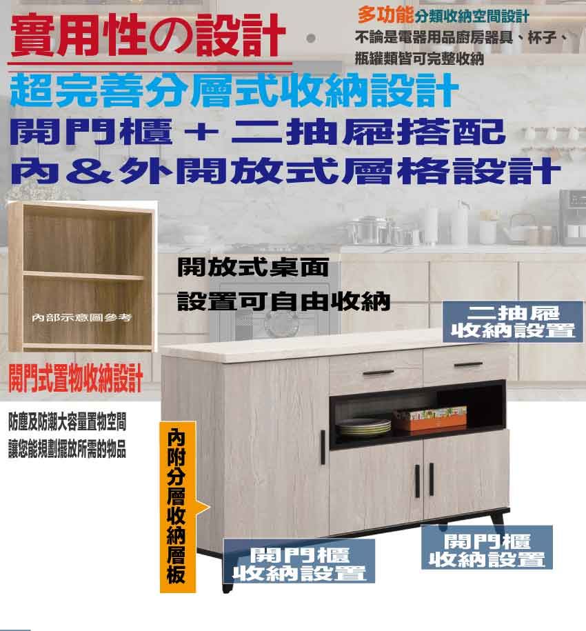 採用開門櫃+二抽屜+內&外開放層格等收納空間設計