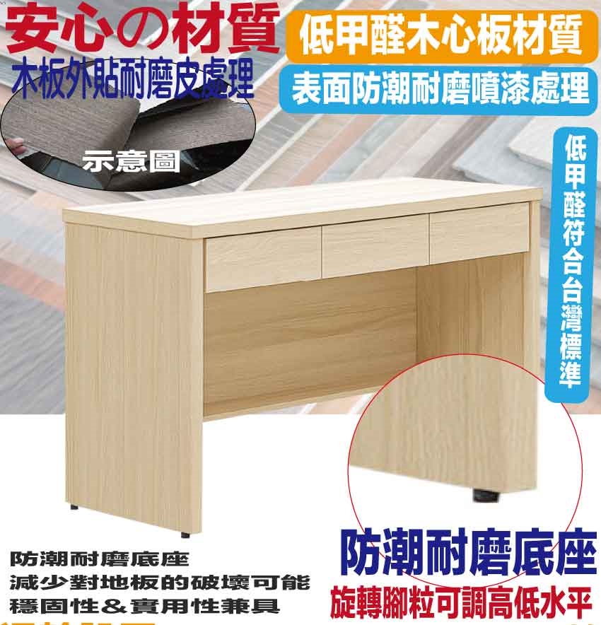 ★偏遠地區需額外加收運費,下標請先問與答詢問★ ★下訂前注意 由於商品流動較快,下訂前請先詢問是否有貨在下訂喔~★ 【綠家居】米科4尺三抽書桌 白橡木紋色系+現代簡約風格+安心材質製造,使用放心+搭配居家更便利,整體採用防蛀木心板+防潮耐磨底座(可調高低水平)等安心材質製造搭配外層採用防潮耐磨噴漆處理 ,採用三抽屜+開放層格&桌面等收納空間設計,全由專人配送到家,專業安心服務,替你省下更多時間!