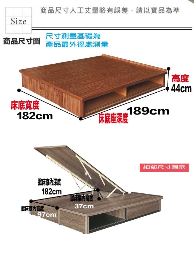 材質 | ◆產品名稱:【綠家居】梅威加高版6尺雙人加大安全扣拉門&後掀床底/掀床(九色可選+高係數氣壓棒+安全扣設計) 床底尺寸:(寬)182x(深)189(高)44/公分 ◆材質: 材質:防蛀木心板+六分木床板+防刮耐磨底座+高磅數氣壓棒(採用330LBS磅數以上氣壓棒) 噴漆:防潮耐磨噴漆處理 |