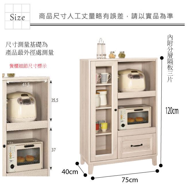 材質 | ◆產品名稱: 【綠家居】馬拉提 淺橡2.5尺單門單抽中餐櫃/收納櫃 產品尺寸: 尺寸:(寬)75x(深)40x(高)120公分 ◆材質: 材質:防蛀木心板+防潮耐磨腳座 材質:防夾手緩衝門片五金+五金滑軌結構 塗漆:優利坦全包式耐磨噴漆處理
