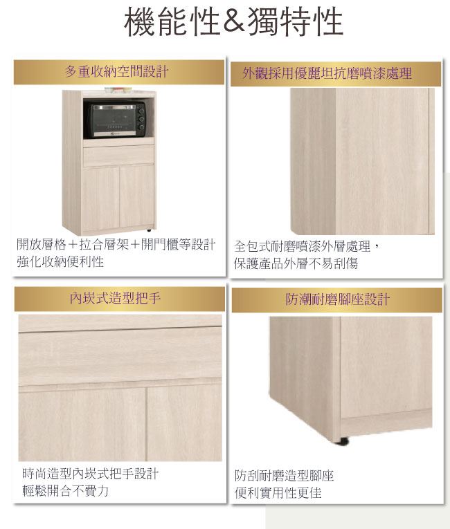 商品介紹 | 【綠家居】馬加柏 淺橡2尺二門單抽餐櫃/收納櫃 淺橡木紋色系+現代簡約風格+安心材質製造,整體採用防蛀木心板+五金滑軌結構+防潮耐磨腳座+仿石面紋路木質桌面板+防夾手緩衝門片五金等安心材質製造,外層採用優利坦全包式耐磨噴漆處理搭配開門櫃+單抽屜+拉合式層架+內&外開放式收納等收納設計,全由專人配送到家,專業安心服務,替你省下更多時間! 【商品特色】 淺橡木紋色系+現代簡約風格+安心材質製造,使用放心+搭配居家更便利 採用防蛀木心板+五金滑軌結構+防潮耐磨腳座+仿石面紋路木質桌面板+防夾手緩衝門片五金等安心材質製造 開門櫃+單抽屜+拉合式層架+內&外開放式收納等收納設計 此商品不需要DIY組立,此商品為組立後之成品 品質保證、專業設計、貼心服務 全由專人配送到家,專業安心服務,替您省下更多時間 |
