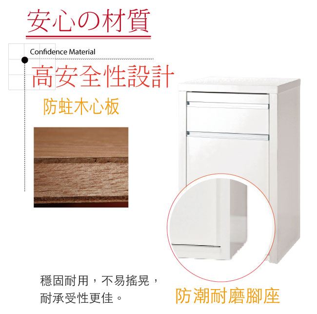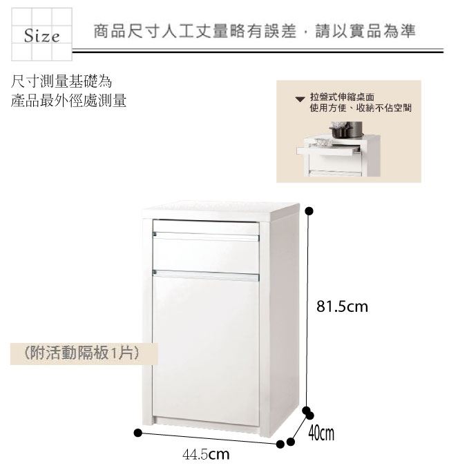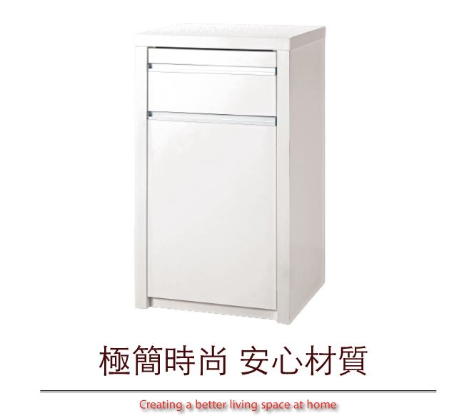 材質 | ◆產品名稱: 【綠家居】古特伊 時尚白1.5尺單門單抽低餐櫃 尺寸:(寬)44.5x(深)40x(高)81.5/公分 ◆材質: 材質:防蛀木心板+防潮耐磨腳座+五金滑軌結構+鋁合金飾條拉合把手 噴漆:防潮亮面噴漆處理