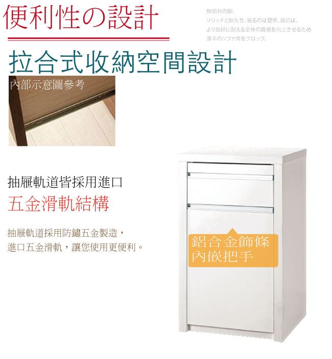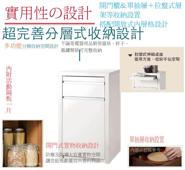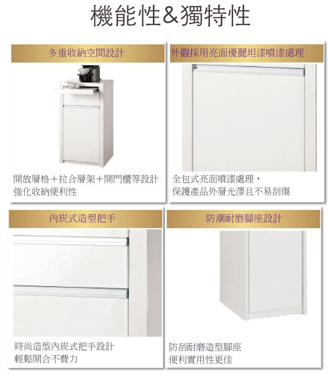 商品介紹 | 【綠家居】古特伊 時尚白1.5尺單門單抽低餐櫃 時尚白色系+現代簡約風格+安心材質製造,整體採用防蛀木心板+防潮耐磨腳座+五金滑軌結構+鋁合金飾條拉合把手等安心材質製造,產品外層採用防潮亮面噴漆處理搭配單抽屜+開門櫃+拉合式層架+內開放式收納層格等收納空間設計,全由專人配送到家,專業安心服務,替你省下更多時間! 【商品特色】 時尚白色系+現代簡約風格+安心材質製造,使用放心+搭配居家更便利 採用防蛀木心板+防潮耐磨腳座+五金滑軌結構+鋁合金飾條拉合把手等安心材質製造 產品外層採用防潮亮面噴漆處理 搭配採用單抽屜+開門櫃+拉合式層架+內開放式收納層格等收納空間設計 此商品不需要DIY組立,此商品為組立後之成品 品質保證、專業設計、貼心服務 全由專人配送到家,專業安心服務,替您省下更多時間 |