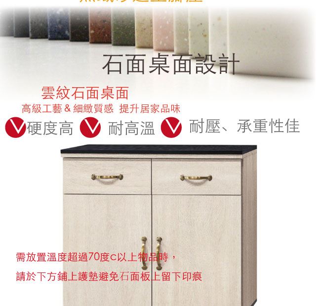 材質 | ◆產品名稱: 【綠家居】瓦利德 時尚2.7尺雲紋石面餐櫃/收納櫃 尺寸:(寬)81x(深)41x(高)82公分 ◆材質: 材質:防蛀木心板+防潮耐磨&防鏽邊框腳座+五金滑軌結構+12mm雲紋石面板 外層採用全包式防潮耐磨噴漆處理
