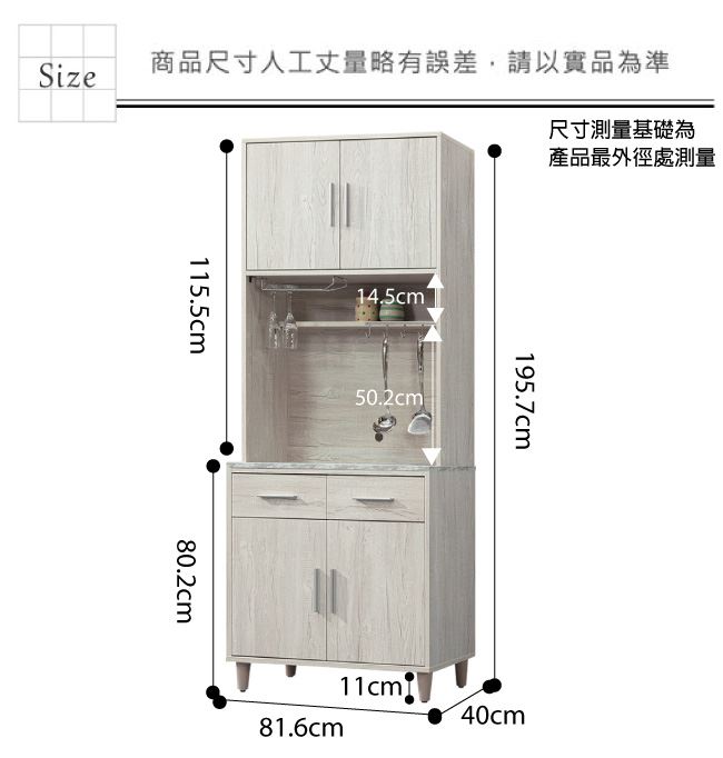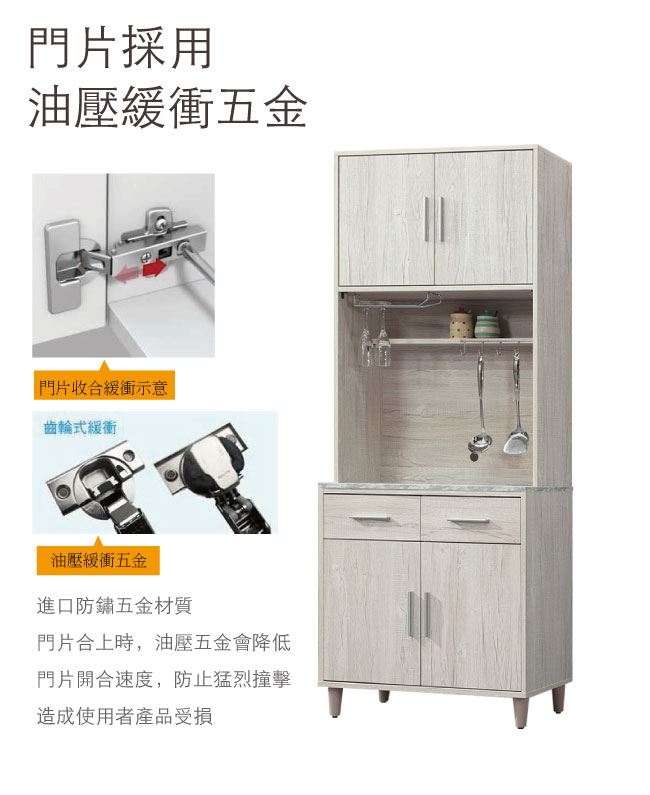 材質 | ◆產品名稱: 【綠家居】瑪波特 橡木紋2.7尺二門二抽高餐櫃組合 產品尺寸: 尺寸:(寬)81.6x(深)40x(高)195.7/公分 ◆材質: 材質:防蛀木心板+防潮耐磨腳座 材質:五金滑軌結構+仿雲紋石紋路木質桌面板+防夾手緩衝門片五金 塗漆:優利坦全包式耐磨噴漆處理