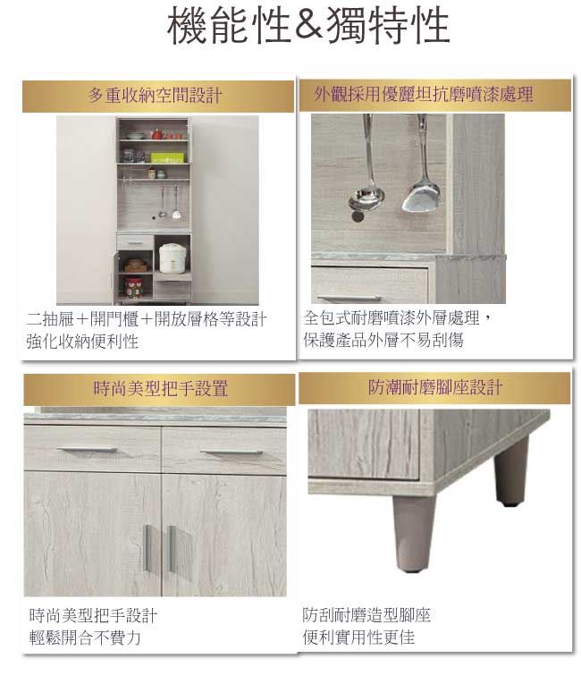 商品 介紹 | 【綠家居】瑪波特 橡木紋2.7尺二門二抽高餐櫃組合 淺橡木紋色系+現代簡約風格+安心材質製造,整體採用防蛀木心板+五金滑軌結構+防潮耐磨腳座+仿雲紋石紋路木質桌面板+防夾手緩衝門片五金等安心材質製造,外層採用優利坦全包式耐磨噴漆處理搭配開門櫃+二抽屜+開放式層格等收納設計,全由專人配送到家,專業安心服務,替你省下更多時間! 【商品特色】 淺橡木紋色系+現代簡約風格+安心材質製造,使用放心+搭配居家更便利 採用防蛀木心板+五金滑軌結構+防潮耐磨腳座+仿雲紋石紋路木質桌面板+防夾手緩衝門片五金等安心材質製造 開門櫃+二抽屜+開放式層格等收納設計 品質保證、專業設計、貼心服務 全由專人配送到家,專業安心服務,替您省下更多時間 |