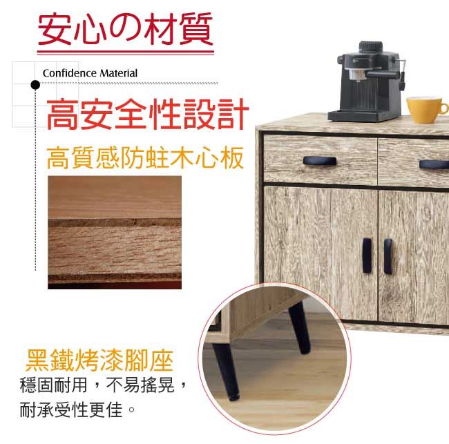 材質 | ◆產品名稱: 【綠家居】愛麗歐 現代2.8尺二門二抽餐櫃/收納櫃 產品尺寸: 尺寸:(寬)83(深)40x(高)75.3/公分 ◆材質: 材質:防蛀木心板+五金滑軌結構+黑鐵烤漆腳座+防夾手緩衝門片五金 塗漆:優利坦全包式耐磨噴漆處理