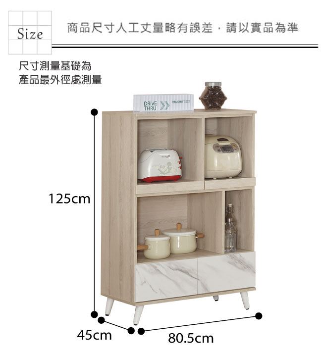 材質 | ◆產品名稱:【綠家居】扎爾 雙色2.7尺二抽餐櫃/收納櫃 尺寸:(寬)80.5x(深)45x(高)125/公分 ◆材質: 材質:防蛀木心板+五金滑軌結構+防潮實木腳座 |