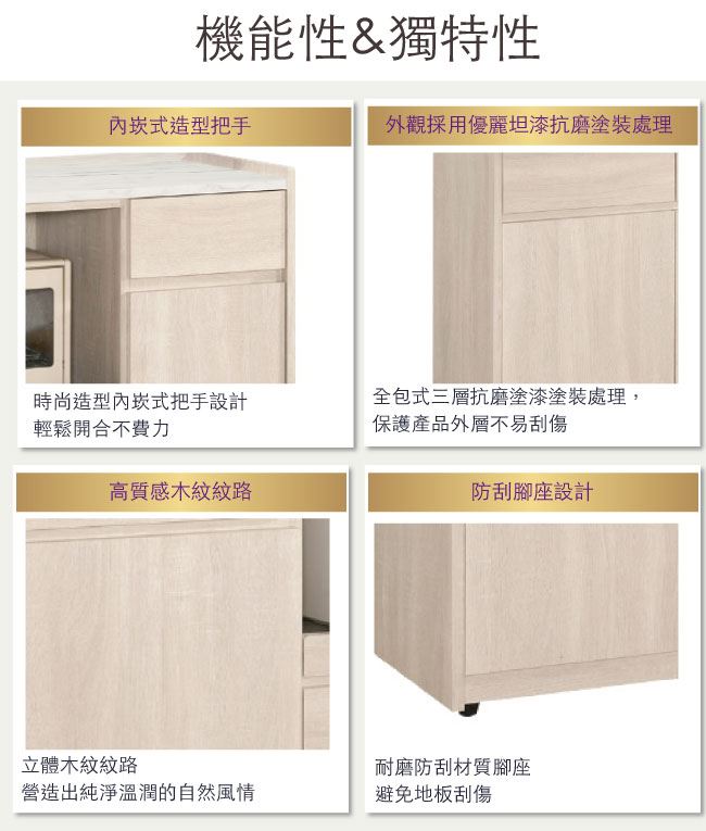 商品介紹 | 【綠家居】曼克特 仿石紋2尺二門單抽餐櫃 淺橡木紋色系+現代簡約風格+安心材質製造,整體採用防蛀木心板+防潮耐磨腳座+五金滑軌結構+防夾手緩衝門片五金+2cm仿石面紋路木質桌面板等安心材質製造,產品外層採用防潮耐磨噴漆處理搭配餐櫃採用單抽屜+開門櫃+開放式層格收納等收納空間設計,全由專人配送到家,專業安心服務,替你省下更多時間! 【商品特色】 淺橡木紋色系+現代簡約風格+安心材質製造,使用放心+搭配居家更便利 採用防蛀木心板+防潮耐磨腳座+五金滑軌結構+防夾手緩衝門片五金+2cm仿石面紋路木質桌面板等安心材質製造 產品外層採用防潮耐磨噴漆處理 餐櫃採用單抽屜+開門櫃+拉合式層架+開放式層格收納等收納空間設計 此商品不需要DIY組立,此商品為組立後之成品 品質保證、專業設計、貼心服務 全由專人配送到家,專業安心服務,替您省下更多時間 |