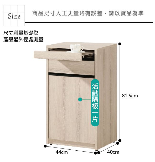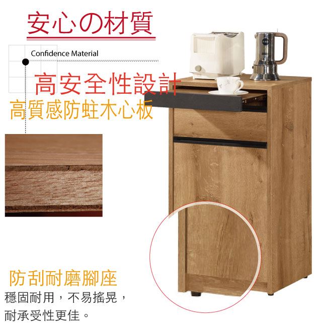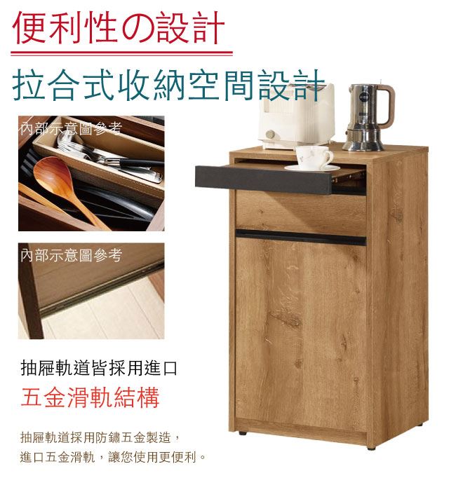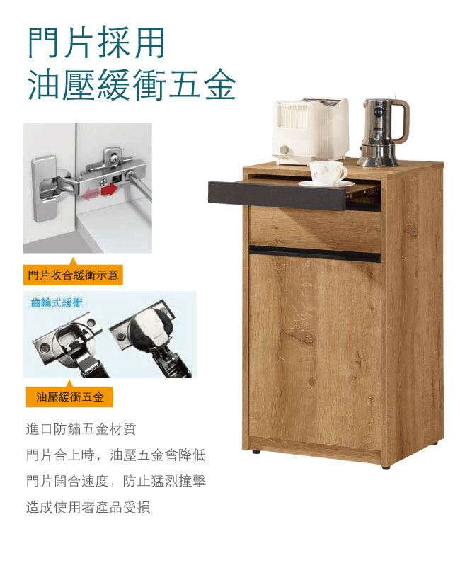 材質 | ◆產品名稱: 【綠家居】雷爾 時尚1.5尺單門單抽餐櫃(二色可選) 原橡木紋尺寸:(寬)44x(深)40x(高)81.5/公分 ◆材質: 材質:防蛀木心板+ 防潮耐磨腳座+五金滑軌結構+防夾手緩衝門片五金 噴漆:防潮耐磨噴漆處理