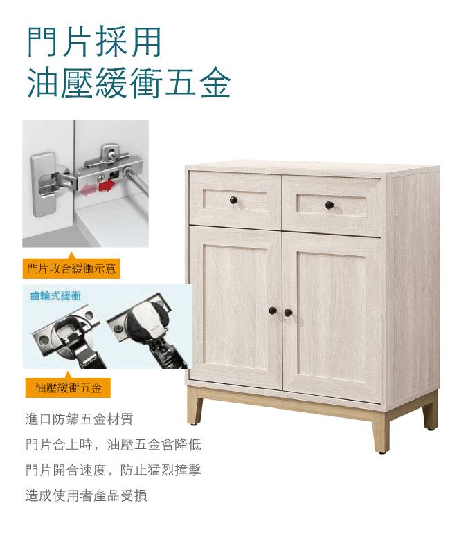 材質 | ◆產品名稱: 【綠家居】范辛頓 時尚2.6尺二門二抽餐櫃/收納櫃 尺寸:(寬)78x(深)39.3x(高)82/公分 ◆材質: 材質:防蛀木心板+防潮耐磨腳座+防夾手緩衝門片五金+五金滑軌結構 噴漆:防潮耐磨噴漆處理