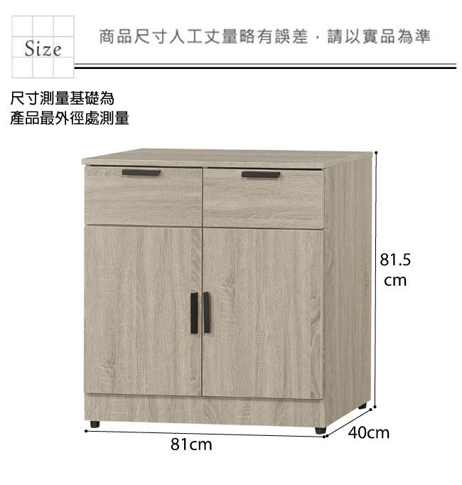 低餐櫃尺寸:(寬)81(深)40(高)81.5公分 ◆材質: 材質:防蛀木心板+防潮耐磨腳座+防夾手緩衝門片五金+五金滑軌結構 噴漆:防潮耐磨噴漆處理