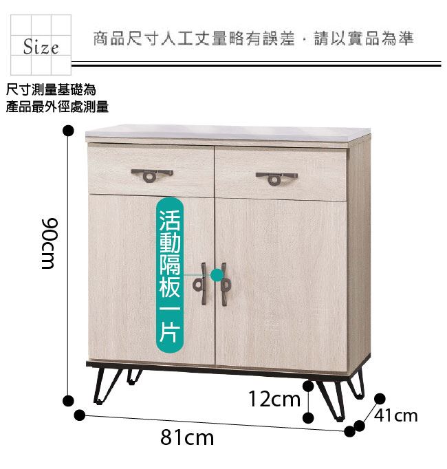 尺寸:(寬)81(深)41(高)90公分 ◆材質: 材質:防蛀木心板+黑鐵砂腳座+防夾手緩衝門片五金+五金滑軌結構+12mm高硬度岩板石桌面板 噴漆:防潮耐磨噴漆處理