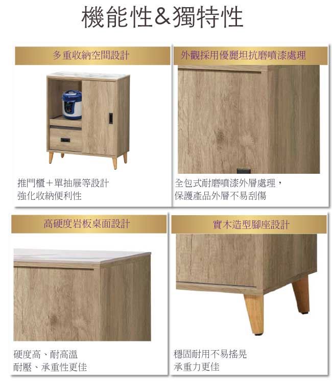 商品 介紹 | 【綠家居】天普推門2.7尺單抽岩板低餐櫃/收納櫃 原橡木紋色系+現代簡約風格+安心材質製造,整體採用防蛀木心板+防潮實木腳座+五金滑軌結構+12mm高硬度岩板石桌面板等安心材質製造,產品外層採用防潮耐磨噴漆處理搭配採用推門櫃+單抽屜+拉盤層架+開放層格等空間設計,全由專人配送到家,專業安心服務,替你省下更多時間! 【商品特色】 原橡木紋色系+現代簡約風格+安心材質製造,使用放心+搭配居家更便利 採用防蛀木心板+防潮實木腳座+五金滑軌結構+12mm高硬度岩板石桌面板等安心材質製造 產品外層採用防潮耐磨噴漆處理 搭配採用推門櫃+單抽屜+拉盤層架+開放層格等空間設計 此商品不需要DIY組立,此商品為組立後之成品 全由專人配送到家,專業安心服務,替您省下更多時間 |