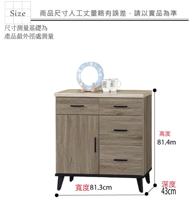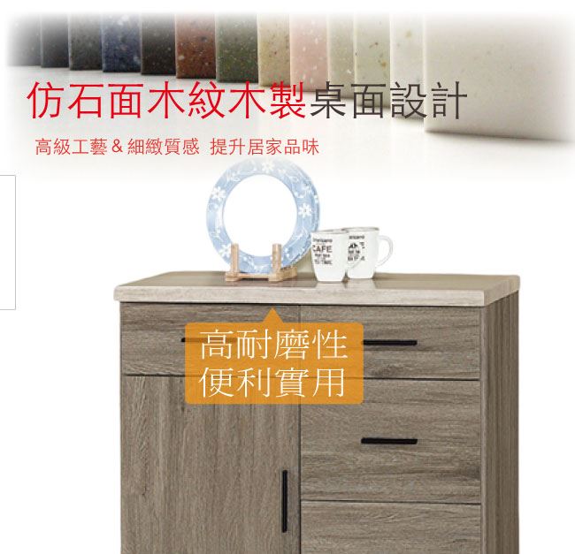 材質 | ◆產品名稱:【綠家居】米丘灰橡2.7尺單門四抽餐櫃/收納櫃 尺寸:(寬)81.3x(深)43(高)81.4/公分 ◆材質: 材質:防蛀木心板+防刮耐磨腳座+五金滑軌結構+仿雲紋石紋木質桌面板+防夾手緩衝門片五金 噴漆:防潮耐磨噴漆處理
