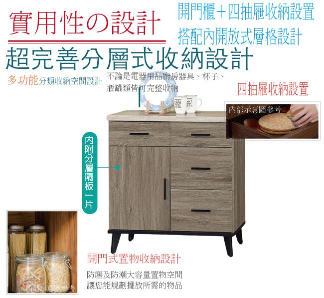 - 開門櫃+四抽屜+內開放層格