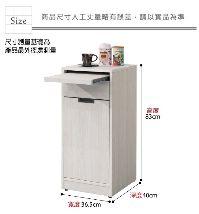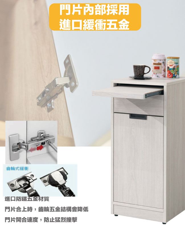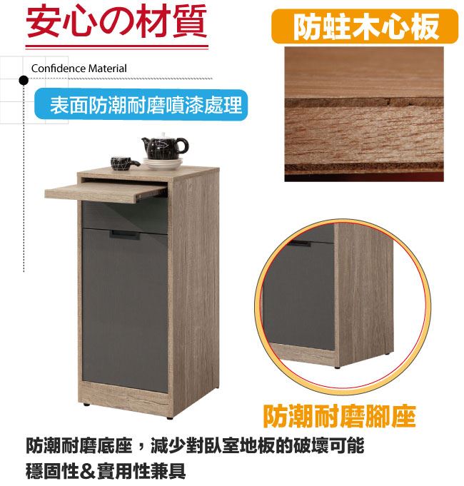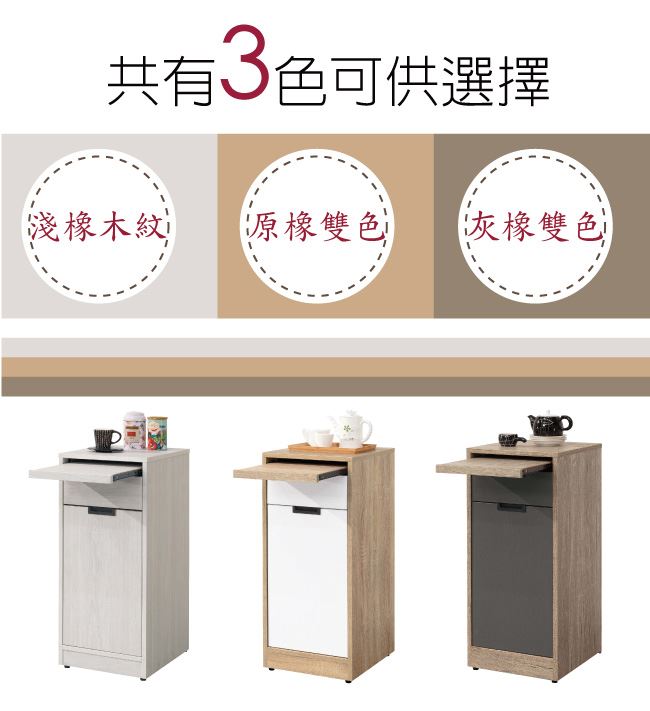 材質 | ◆產品名稱:【綠家居】凱溫斯1.2尺拉盤單抽低餐櫃/收納櫃(三色可選) 拉盤櫃尺寸:(寬)36.5x(深)40(高)83公分 ◆材質: 材質:防蛀木心板+防潮耐磨腳座+五金滑軌結構+防夾手緩衝門片五金 噴漆:防潮耐磨噴漆處理