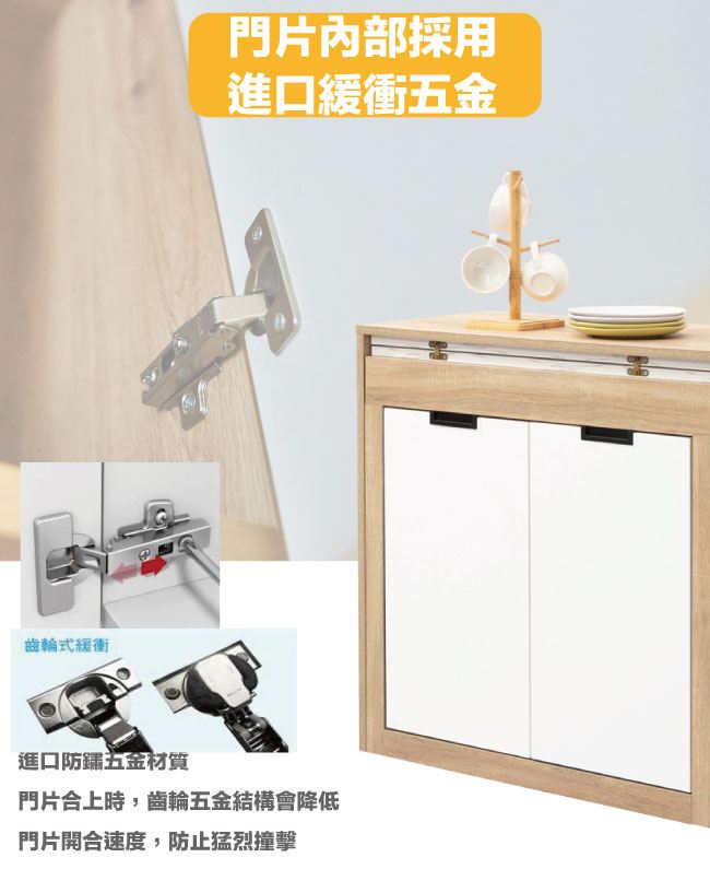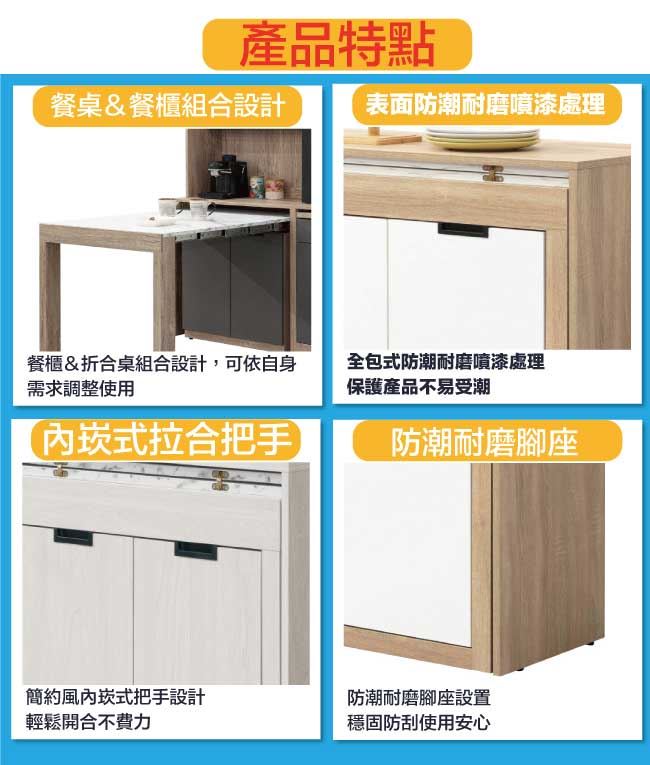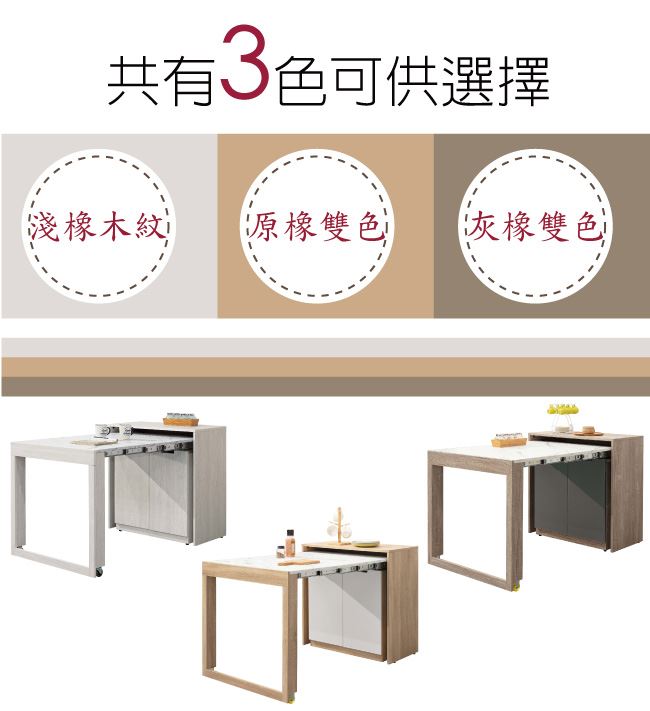 商品 介紹 | 【綠家居】凱溫斯2.7尺桌面伸縮餐櫃/中島桌(三色可選+可拉出桌面使用) 三色可選+現代簡約風格+安心材質製造,整體採用防蛀木心板+防潮耐磨腳座+防夾手緩衝門片五金+便利滑輪設置(中島桌櫃)等安心材質製造,產品外層採用防潮耐磨噴漆處理搭配採用開門櫃+開放式層格等收納空間設計,全由專人配送到家,專業安心服務,替你省下更多時間! 【商品特色】 三色可選+現代簡約風格+安心材質製造,使用放心+搭配居家更便利 中島桌櫃桌面可拉出使用,不用時可收合變化,讓居家空間最大化 採用防蛀木心板+防潮耐磨腳座+防夾手緩衝門片五金+便利滑輪設置(折合桌)等安心材質製造 產品外層採用防潮耐磨噴漆處理 採用開門櫃+開放式層格等收納空間設計 此商品不需要DIY組立,此商品為組立後之成品 品質保證、專業設計、貼心服務 全由專人配送到家,專業安心服務,替您省下更多時間 |