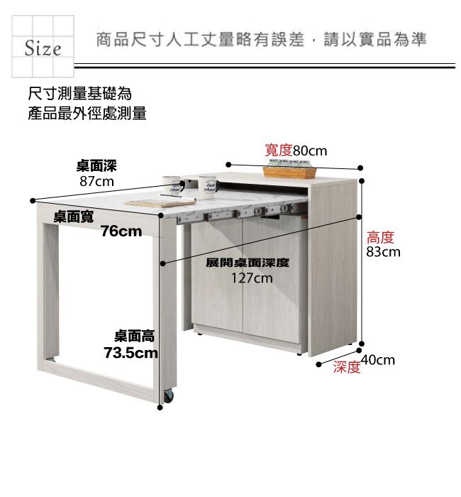 材質 | ◆產品名稱:【綠家居】凱溫斯2.7尺桌面伸縮餐櫃/中島桌(三色可選+可拉出桌面使用) 中島桌櫃尺寸:展開(寬)40x(深)127(高)83公分 收合(寬)80x(深)40(高)83公分 ◆材質: 材質:防蛀木心板+防潮耐磨腳座+防夾手緩衝門片五金+便利滑輪設置(中島桌櫃) 噴漆:防潮耐磨噴漆處理