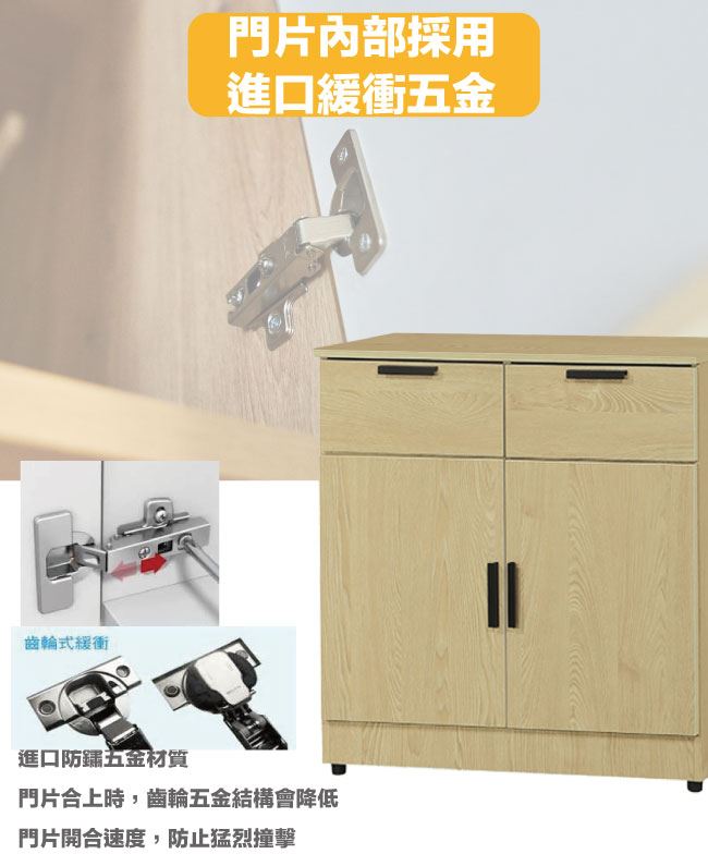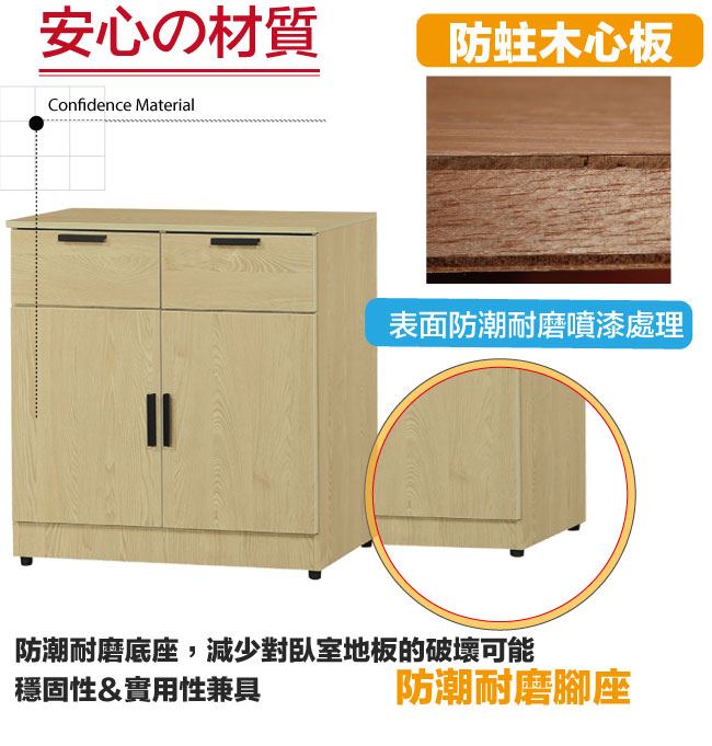 材質 | ◆產品名稱:【綠家居】路思樂2.7尺二門二抽餐櫃 餐櫃尺寸:(寬)81x(深)40(高)81.5公分 ◆材質: 材質:防蛀木心板+防潮耐磨腳座+防夾手緩衝門片五金+五金滑軌結構 噴漆:防潮耐磨噴漆處理