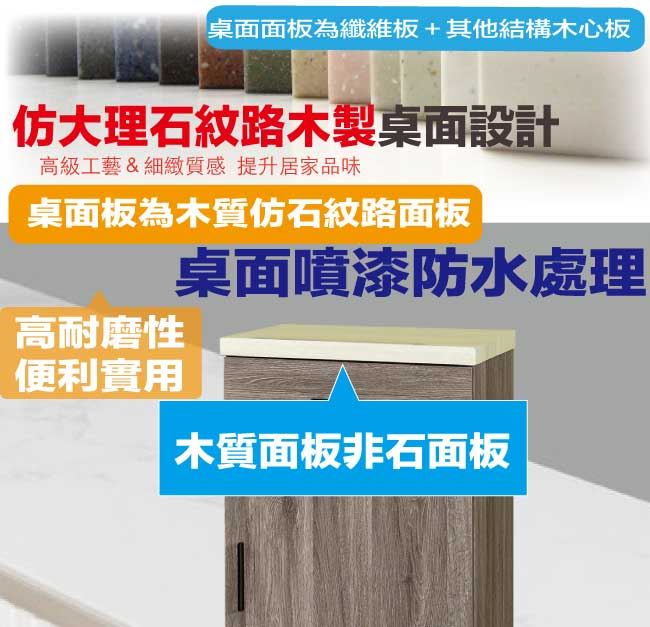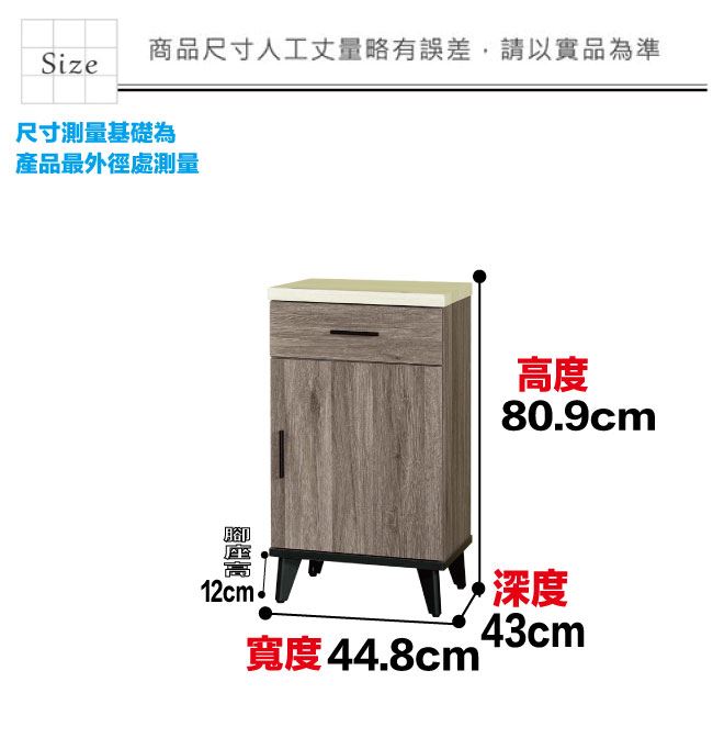 材質 | ◆產品名稱:【綠家居】歐曼1.5尺單門單抽低餐櫃/置物櫃 尺寸:(寬)44.8x(深)43(高)80.9/公分 ◆材質: 材質:防蛀木心板+防潮黑漆腳座+五金滑軌結構+防夾手緩衝門片五金+仿雲紋石紋路木質桌面板(MDF纖維板材質) 噴漆:防潮耐磨噴漆處理