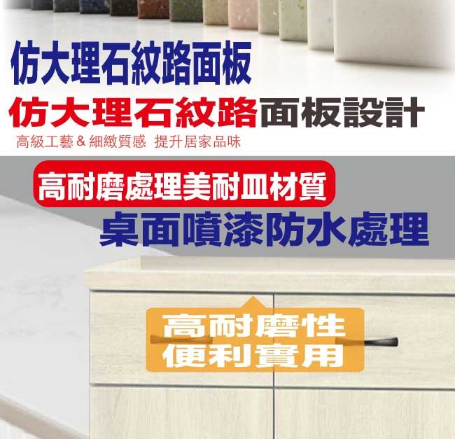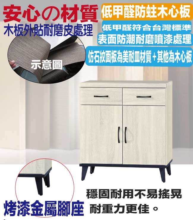 材質 | ◆產品名稱:【綠家居】楚門淺橡2.7尺二門二抽低餐櫃 尺寸:(寬)81x(深)43x(高)81.5/公分 ◆材質: 材質:防蛀木心板+烤漆金屬腳座+仿大理石紋耐磨美耐皿面板+五金滑軌結構+防夾手緩衝門片五金 表面防潮耐磨噴漆處理 |