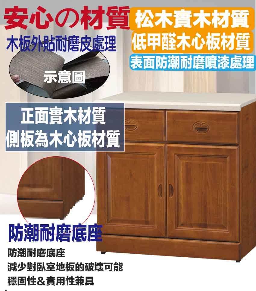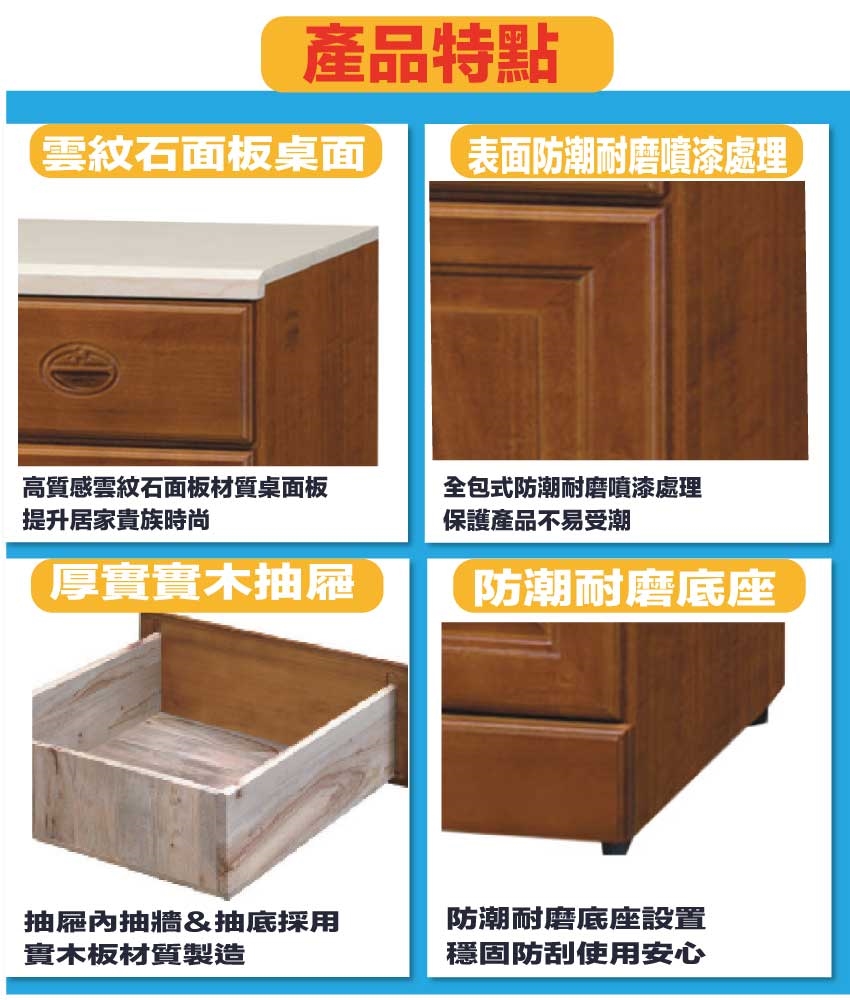 松木實木+防蛀木心板+防潮耐磨底座(可調高低水平)+2cm雲紋石面桌面板等安心材質製造