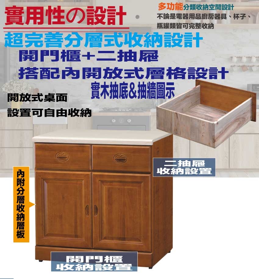 採用開門櫃+二抽屜+內開放層格等收納空間設計