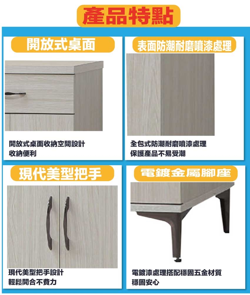 材質:防蛀木心板+烤漆金屬腳座+防夾手緩衝門片五金 -