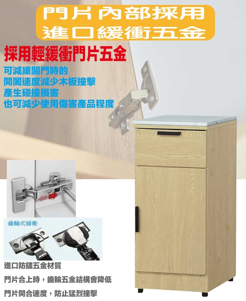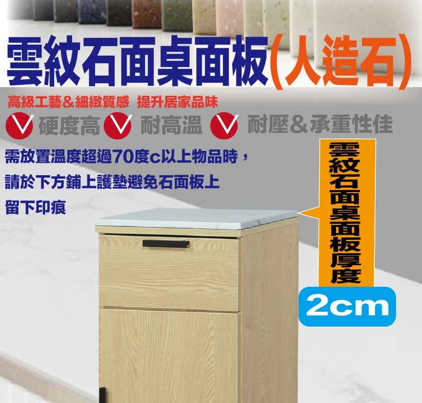 材質:防蛀木心板+防潮耐磨底座(可調高低水平)+防夾手緩衝門片五金+2cm雲紋石面桌面板 -