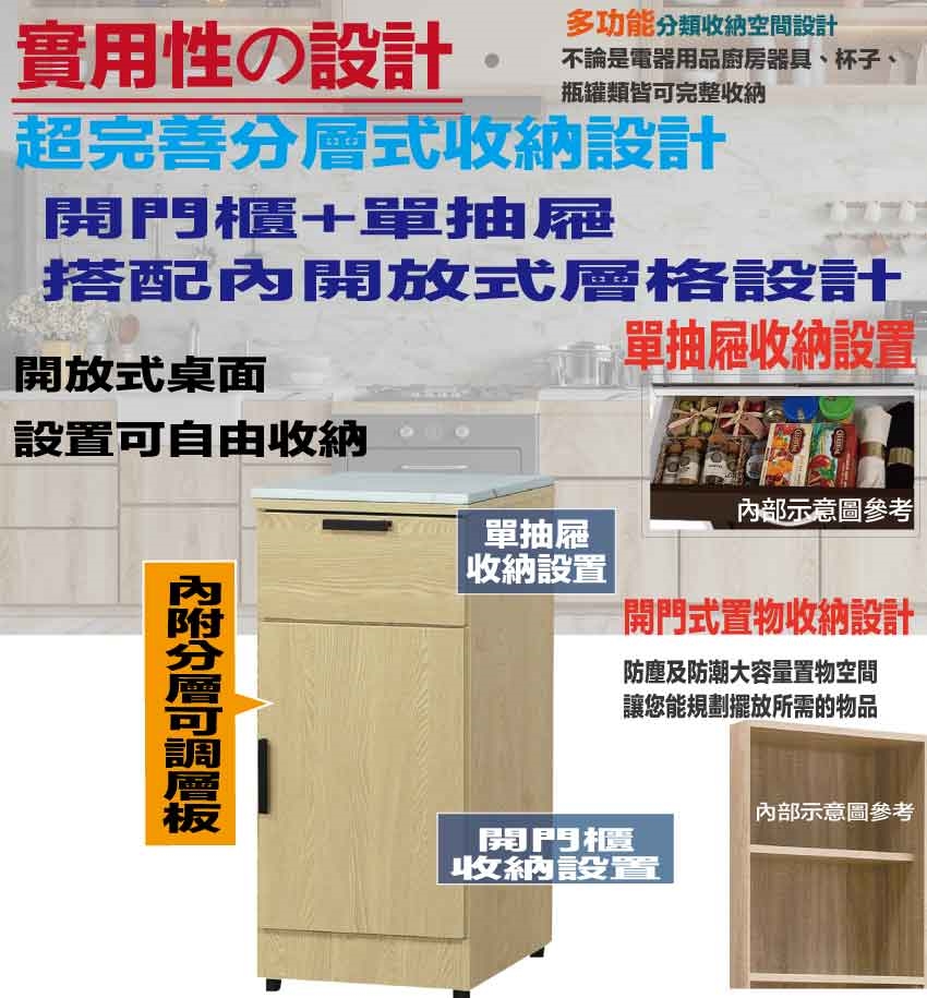 採用開門櫃+單抽屜+內開放層格等收納空間設計