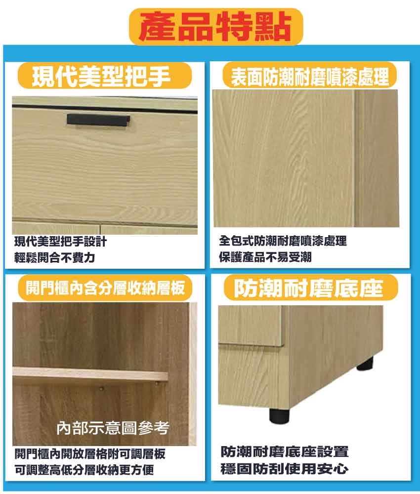 採用開門櫃+單抽屜+內開放層格等收納空間設計