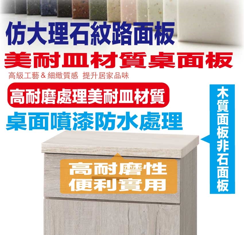 材質:防蛀木心板+仿大理石紋路耐磨美耐皿面板+烤漆金屬腳座+防夾手緩衝門片五金
