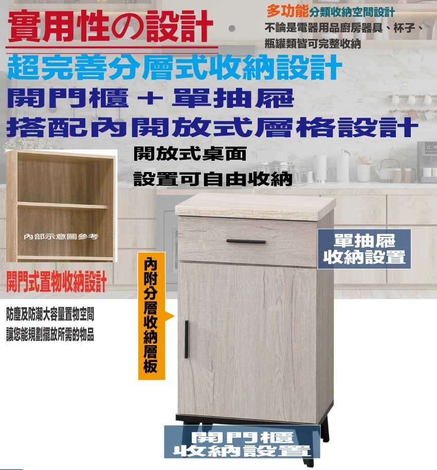 採用開門櫃+單抽屜+內開放層格等收納空間設計