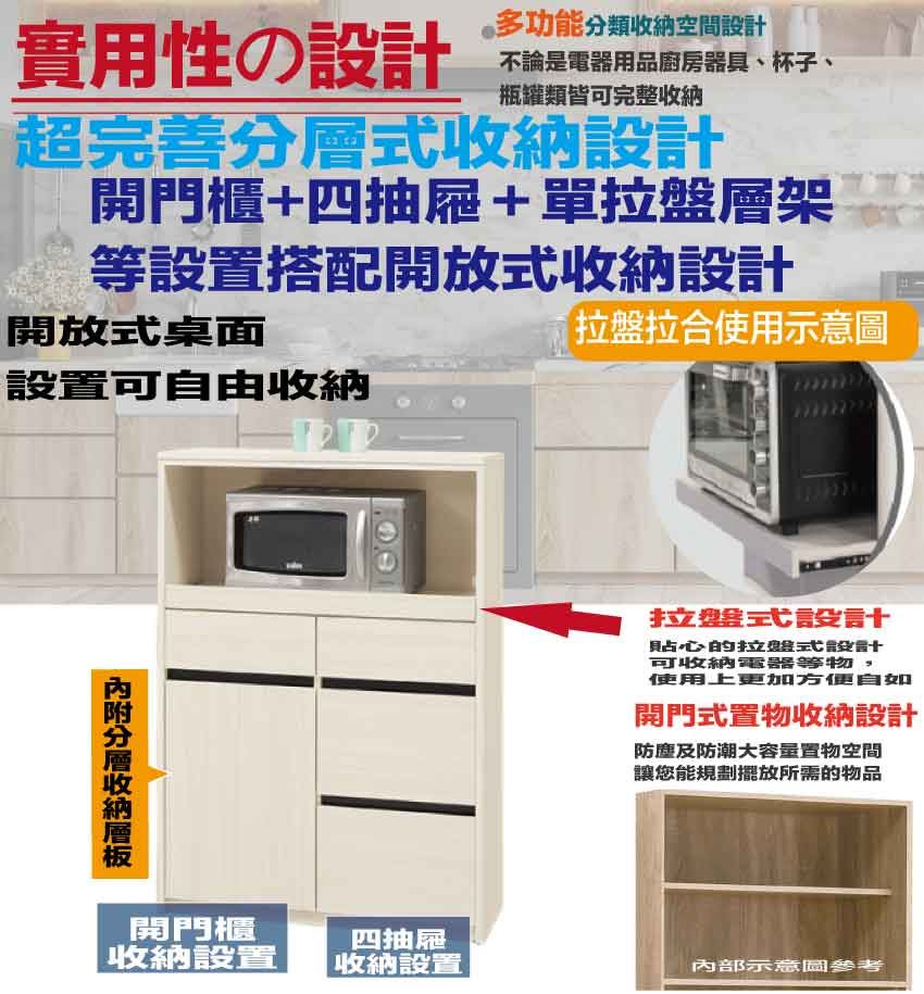 採用開門櫃+拉合式托盤層架+四抽屜+內&外開放層格等收納空間設計