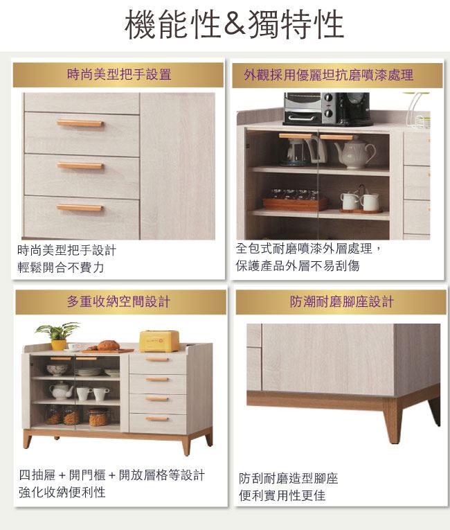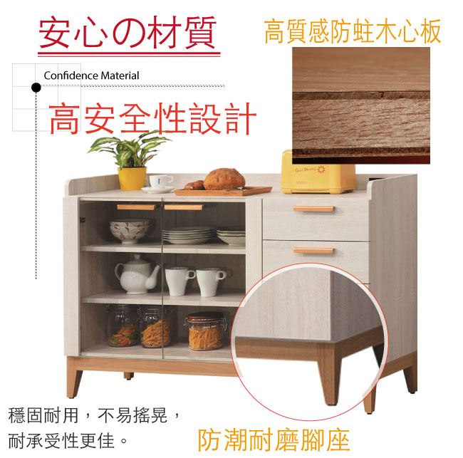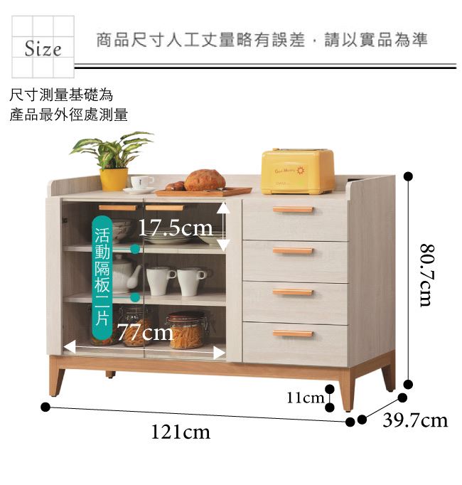 材質 | ◆產品名稱:【綠家居】 伊森瑪 雙色4尺二門四抽餐櫃/收納櫃 尺寸:(寬)121x(深)39.7x(高)80.7/公分 ◆材質: 材質:防蛀木心板+防潮耐磨腳座+防夾手緩衝門片五金+五金滑軌結構+強化玻璃門片 |