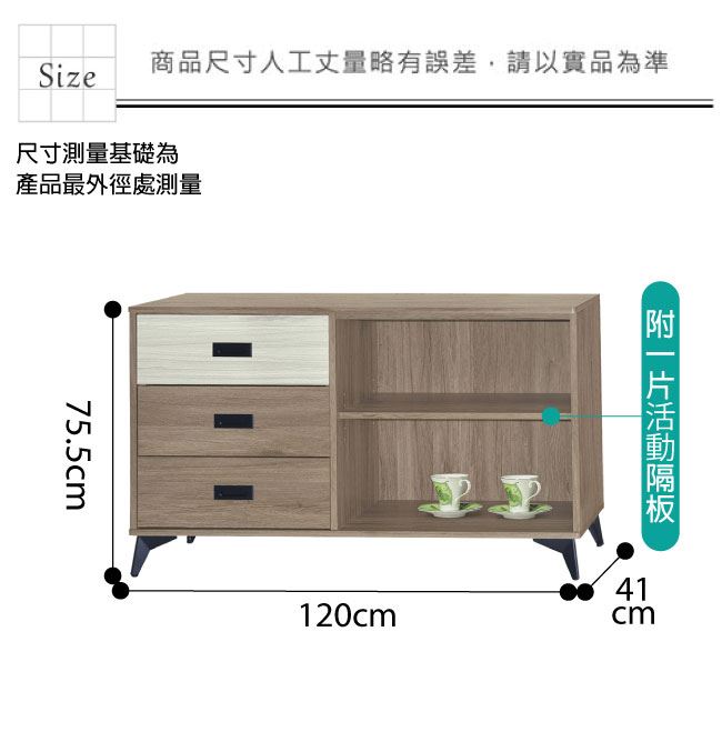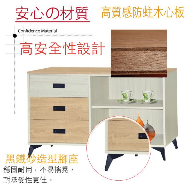 材質 | ◆產品名稱:【綠家居】甘托克 現代4尺三抽開放式餐櫃/收納櫃(二色可選) 收納櫃尺寸:(寬)120x(深)41x(高)75.5/公分 ◆材質: 材質:防蛀木心板+黑鐵砂腳座+五金滑軌結構 塗漆:優利坦三層全包式耐磨塗漆塗裝處理 |