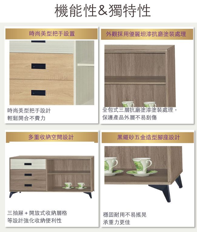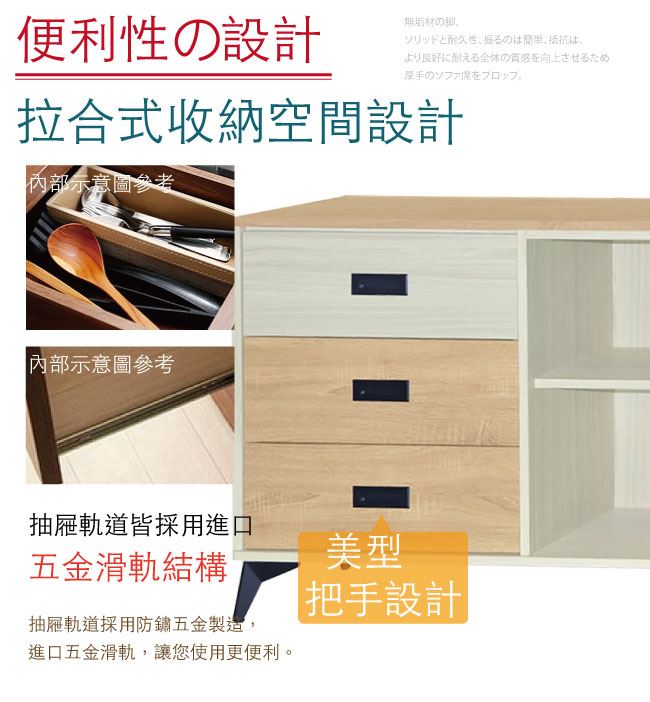 商品介紹 | 【綠家居】甘托克 現代4尺三抽開放式餐櫃/收納櫃(二色可選) 二色可選+現代簡約風格+安心材質製造,整體採用防蛀木心板+黑鐵砂腳座+五金滑軌結構等安心材質製造,外層採用優利坦三層全包式耐磨塗漆塗裝處理搭配採用開三抽屜+開放式層格等收納設計,全由專人配送到家,專業安心服務,替你省下更多時間! 【商品特色】 二色可選+現代簡約風格+安心材質製造,使用放心+搭配居家更便利 採用防蛀木心板+黑鐵砂腳座+五金滑軌結構等安心材質製造 採用三抽屜+開放式層格等收納設計 此商品不需要DIY組立,此商品為組立後之成品 品質保證、專業設計、貼心服務 全由專人配送到家,專業安心服務,替您省下更多時間 |
