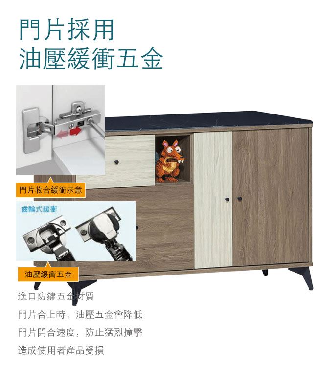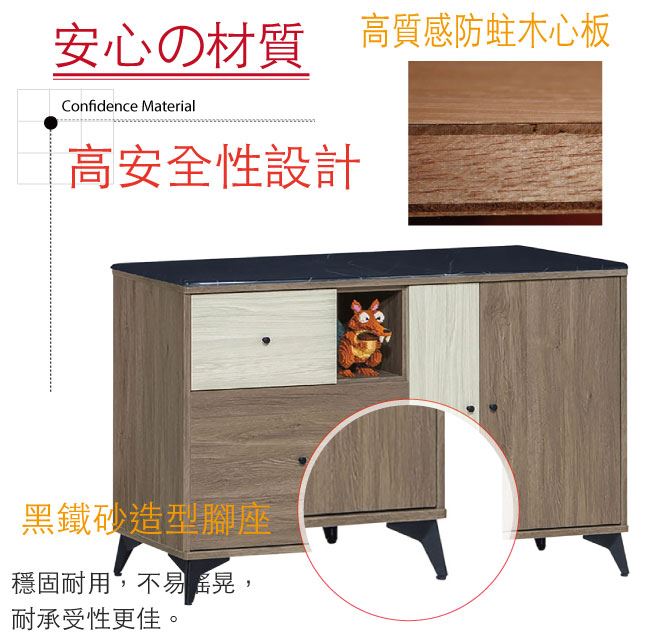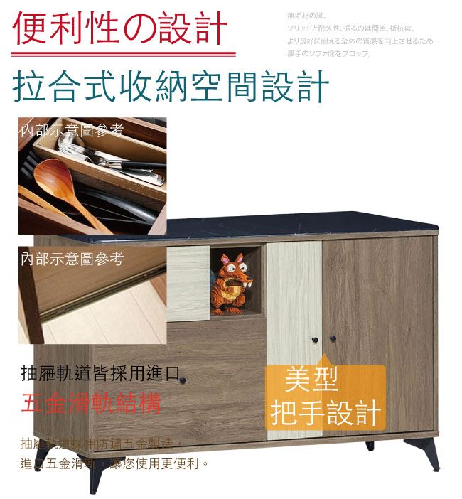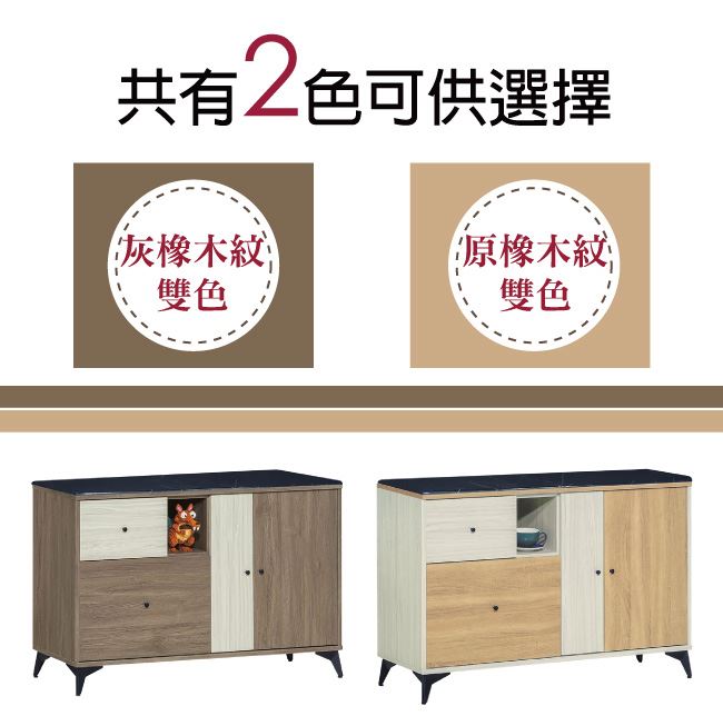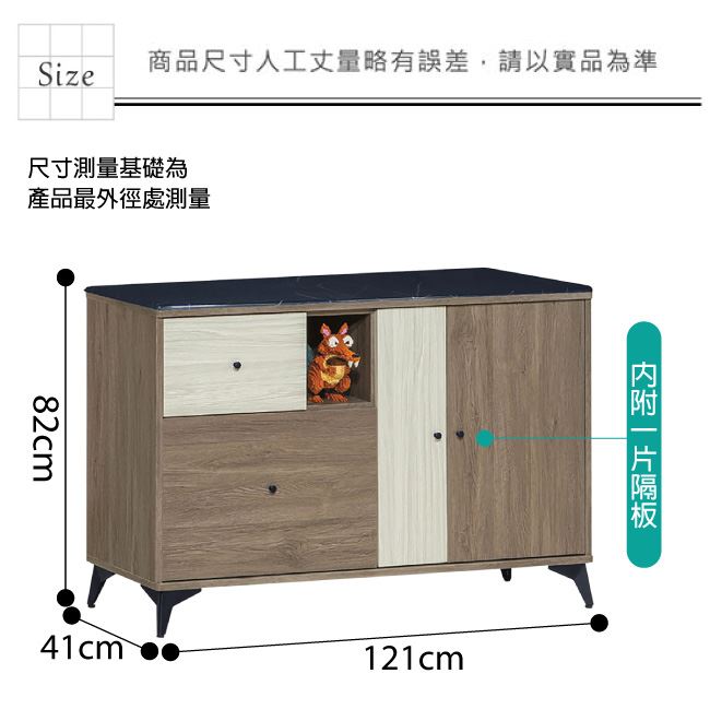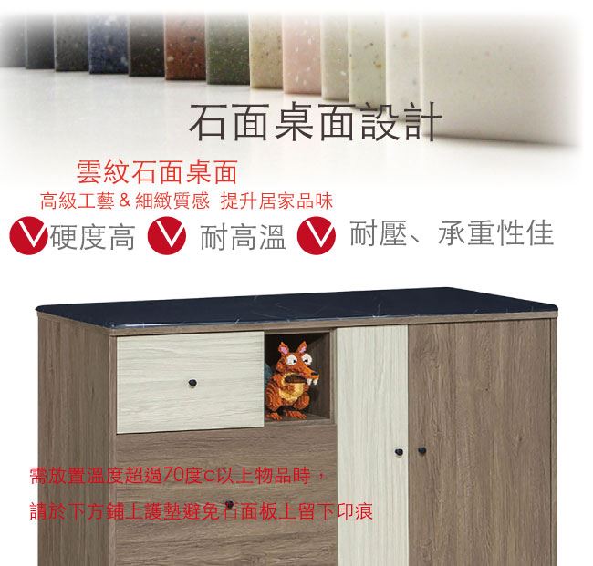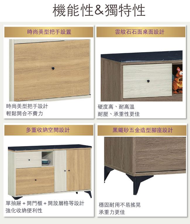 材質 | ◆產品名稱:【綠家居】甘托克 現代4尺雲紋石面餐櫃/收納櫃(二色可選) 收納櫃尺寸:(寬)121x(深)41x(高)82/公分 ◆材質: 材質:防蛀木心板+黑鐵砂腳座+五金滑軌結構+防夾手緩衝門片五金+1.2cm雲紋石面 塗漆:優利坦三層全包式耐磨塗漆塗裝處理 |